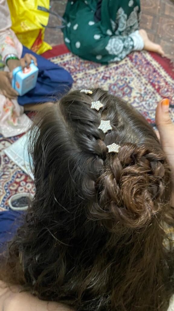 17.08.2024 निर्भया फाउंडेशन की मुस्तफाबाद ब्रांच में तमन्ना सैफई छात्राओं को beautician का काम सिखाते हुए।